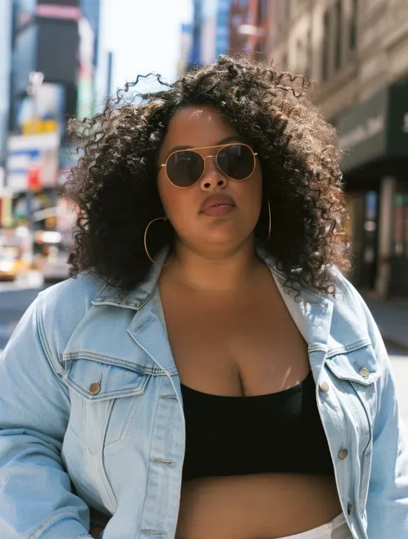 This outfit is all about effortless cool. The oversized light blue denim jacket adds a relaxed vibe while the black crop top underneath keeps it edgy and modern. Paired with crisp white jeans, the outfit strikes a perfect balance between casual and stylish. To complete the look, the round sunglasses and a bold stance add that I m ready to conquer the worldâ feel, making it perfect for a sunny day out.