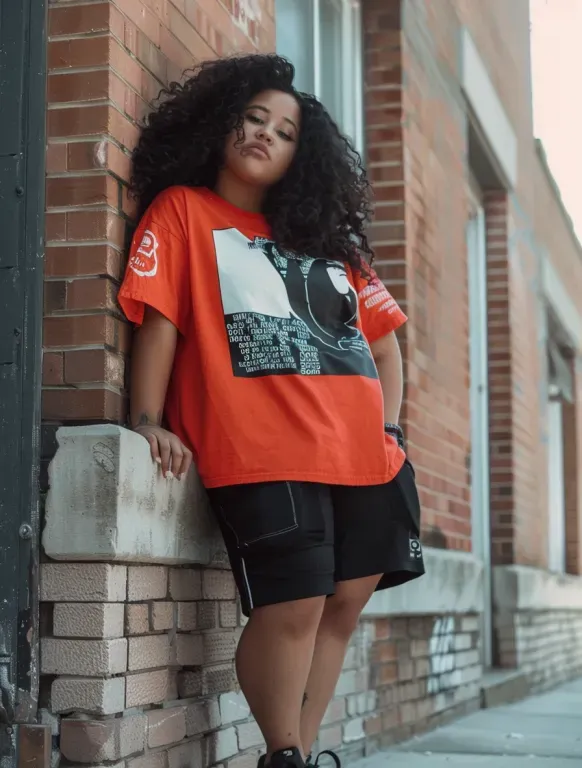 This fun and bold plus-size summer outfit combines street style with a relaxed vibe. The standout piece is a vibrant red oversized graphic t-shirt with bold text and an artistic print, adding a pop of color and personality to the outfit. Paired with black shorts that feature side pockets and sporty details, the look is comfortable and casual. The outfit is completed with a pair of classic black and white sneakers, perfect for a day of running errands or hanging out with friends.