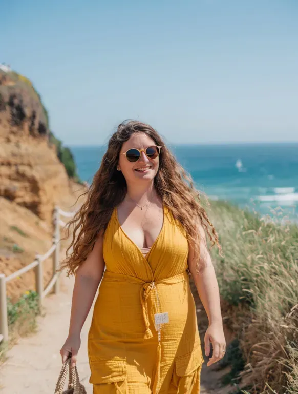 This stunning plus-size summer outfit is all about laid-back beachy vibes. The mustard yellow dress features a deep v-neckline with a tie at the waist, allowing for a customizable fit that accentuates your curves. The fabric is light and airy, perfect for staying cool while looking stylish on a sunny day. With its relaxed silhouette and slightly flared bottom, the dress flows effortlessly as you walk, giving off a carefree boho look. A woven straw tote and sunglasses finish off the ensemble, adding the perfect beachy touch.
