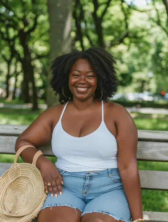 This casual plus-size summer outfit is the perfect mix of comfort and style. The look features a simple yet chic white tank top paired with light blue denim shorts, offering an easygoing, laid-back vibe. The soft, breathable tank is complemented by the relaxed fit of the shorts, making it ideal for those warm days spent outdoors. Accessorized with a straw handbag and simple jewelry, this ensemble captures the essence of summer.