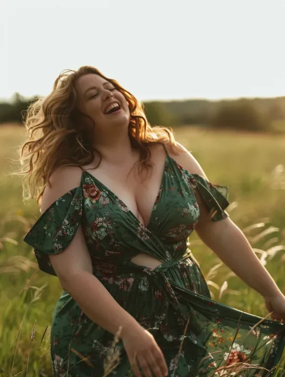This gorgeous plus-size summer outfit features a stunning green floral wrap dress that embodies a playful, feminine vibe. The dress has a flattering v-neckline, with ruffled off-the-shoulder sleeves that give it a touch of romance. The tie at the waist accentuates the curves and creates a lovely silhouette, while the flowing skirt moves beautifully with each step. Perfect for warm weather, this dress offers both comfort and style, making it ideal for outdoor events or casual gatherings.