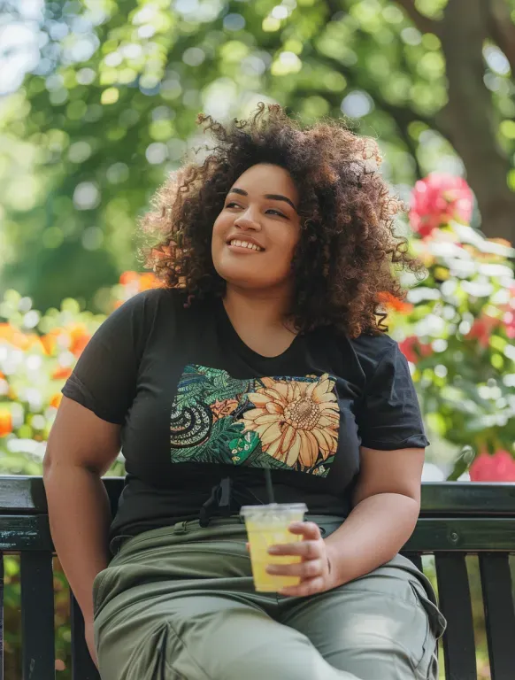 This cute plus-size summer outfit combines comfort with a fun, laid-back style. The black t-shirt features a vibrant, colorful sunflower graphic, which brings a pop of brightness to the simple design. Paired with loose-fitting olive green cargo pants, this outfit offers an effortless vibe, perfect for a sunny day out. The casual style is completed with a refreshing drink in hand, making it ideal for relaxing at the park or hanging out with friends.