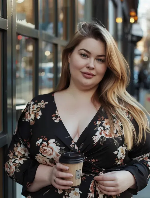 This plus-size summer outfit is perfect for a romantic and effortless look. The soft, flowy maxi dress features a delicate floral pattern in muted tones, with a plunging neckline and voluminous bell sleeves that create an elegant yet relaxed vibe. The dress is cinched at the waist with a tie belt, accentuating the figure while maintaining a comfortable, breezy fit. Its soft fabric gently flows with each movement, making it perfect for outdoor gatherings or a serene walk by the water.