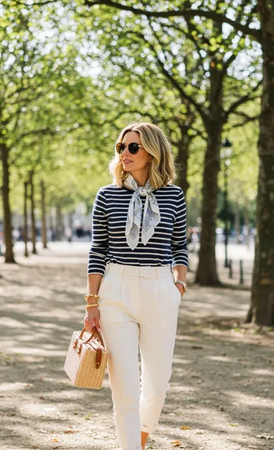 This outfit combines classic Parisian chic with a playful twist. The navy and white striped top adds that timeless French vibe, while the soft silk scarf tied around the neck brings a touch of elegance. The high-waisted white trousers create a sleek silhouette, and the wicker handbag is both functional and stylish, perfectly complementing the outfit. With sunglasses and a relaxed, confident posture, this look is effortlessly chic for any warm summer day in the city.