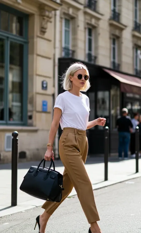 This classic outfit features a crisp white t-shirt tucked into high-waisted beige trousers. The simple yet refined look is elevated with a structured black handbag and black heels, creating an outfit that is chic, comfortable, and perfect for a day in the city. The loose fit of the t-shirt and the tailored cut of the pants balance each other out, making this look both stylish and practical.