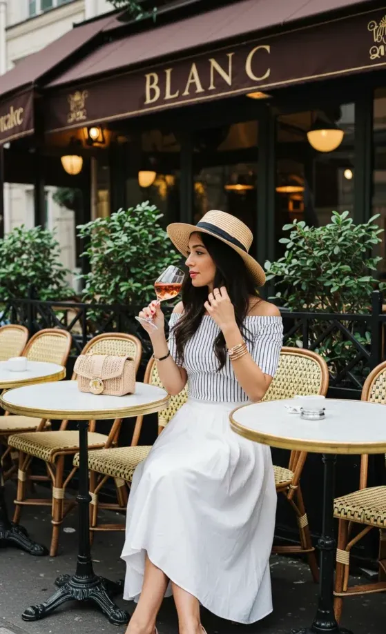 This Parisian chic outfit features a playful off-the-shoulder striped top, paired with a flowing white skirt that gives it a light and breezy feel. The wide brimmed straw hat adds a touch of summer elegance, and the beige heels keep the outfit grounded in comfort. Holding a glass of rosé and a stylish woven bag, the ensemble exudes effortless sophistication perfect for an afternoon at a charming café.