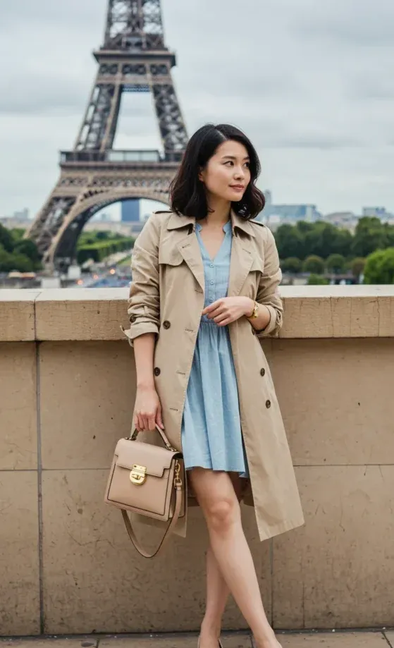 This elegant outfit combines a chic, beige trench coat over a soft, light blue button-down dress, creating a sophisticated yet breezy look perfect for a Parisian summer day. The trench coat adds structure and warmth, while the dress gives it a relaxed, feminine touch with its simple A-line cut. Paired with nude ballet flats and a neutral handbag, the ensemble is polished but still laid-back, making it ideal for exploring the city or enjoying a café break by the Eiffel Tower.