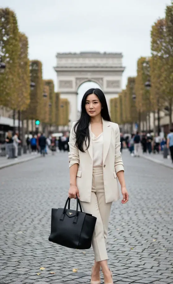 This effortlessly chic outfit features a beige tailored suit, consisting of a sleek blazer and high-waisted trousers, creating a polished, sophisticated silhouette. The ensemble is paired with a simple cream blouse and nude heels, which complement the neutral tones of the suit perfectly. A classic black tote bag adds a touch of contrast, making the look both practical and stylish. Set against the backdrop of the iconic Arc de Triomphe, this outfit is a stunning example of Parisian elegance.