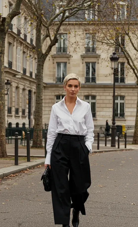 I absolutely love how effortlessly chic and powerful this look feels. The wide-legged trousers give it a fashion-forward edge, while the white shirt keeps it clean and classic. It s the kind of outfit that s both comfortable and stylish, and the black accessories just pull it all together. Whether you re heading to a meeting or simply strolling through the city, this outfit is all about showing off that Parisian flair with a sleek and modern twist. I could totally picture myself wearing this for a laid-back day in Paris, feeling both confident and stylish!