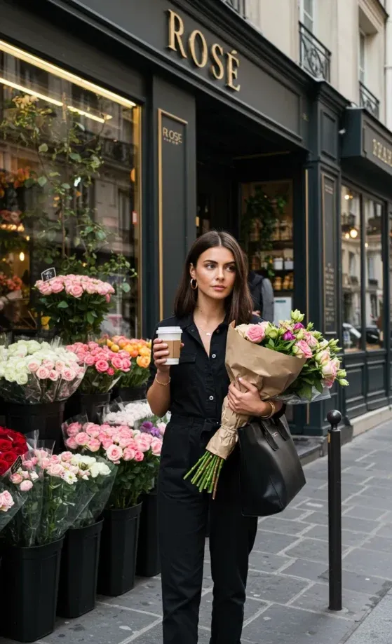 This look features a classic black jumpsuit with a flattering button-down design and relaxed yet tailored fit, perfect for a chic Parisian summer day. Paired with black loafers and a stylish oversized black handbag, this outfit strikes a balance between casual and polished. The addition of a fresh bouquet of flowers and a coffee in hand makes it a look that s both effortlessly stylish and practical for running errands or enjoying a stroll through the city.