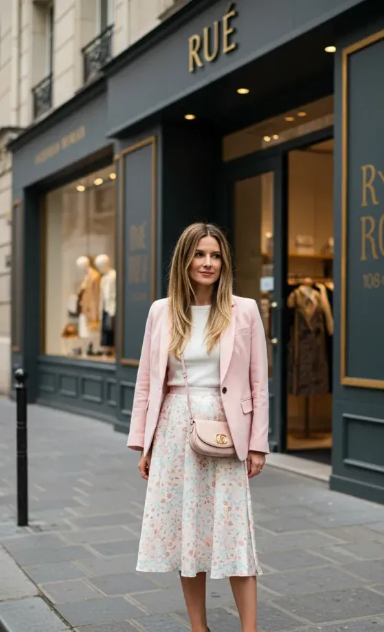 This stunning outfit combines a soft pink blazer with a simple white top and a beautifully feminine floral skirt. The blush pink tone of the blazer adds a soft elegance, while the flowing floral skirt gives the outfit a touch of whimsy. Paired with a nude handbag and classic beige heels, this look feels effortlessly chic and polished, perfect for a day out or an afternoon gathering in the city.