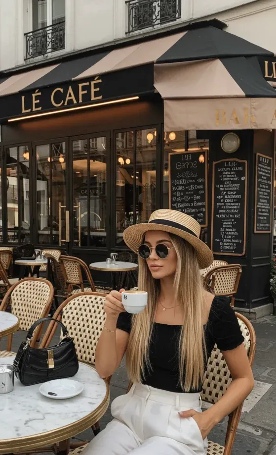 This effortless yet chic look features a black fitted top with a slight sweetheart neckline paired with high-waisted, wide-legged white trousers. The outfit is completed with simple black sandals, a black handbag, and a trendy straw hat, perfectly suited for a sunny day in Paris. The contrast between the black and white elements creates a sophisticated yet laid-back vibe, making it ideal for a day of strolling through the city or enjoying a coffee at a café.
