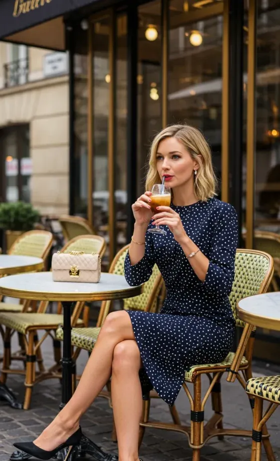 This outfit captures the essence of Parisian chic with its timeless navy polka-dot dress. The fitted silhouette flatters the figure, while the long sleeves and knee-length hem make it perfect for any occasion. The outfit is paired with black pointed-toe heels and a quilted handbag, adding a touch of sophistication to the casual elegance of the dress. The soft background of a Parisian café and the subject sipping her drink further enhance the overall effortlessly chic vibe.