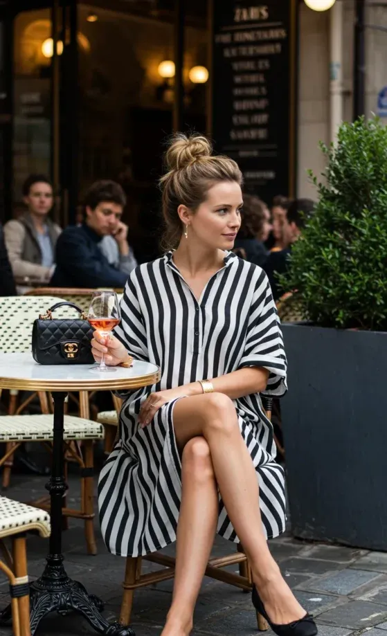 This black-and-white striped dress is the epitome of Parisian chic. The loose-fitting dress features a relaxed, button-down design that drapes effortlessly while still showing off the figure. Paired with simple black flats, the outfit is completed with a sleek handbag and a glass of rosé, giving it an effortlessly elegant yet laid-back vibe. The subtle pattern adds an interesting contrast without overwhelming the look, making it perfect for a casual café outing or a stroll through the city.