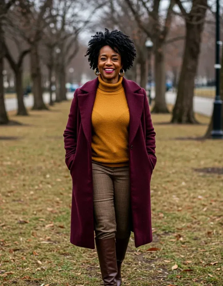 This outfit is all about cozy sophistication. The warm mustard turtleneck brings a golden pop of color that feels just right for fall, while the deep wine-colored coat adds richness and elegance. Paired with fitted plaid trousers and sleek brown leather knee-high boots, this look is both polished and practical for chilly days. The gold hoop earrings add a touch of shine, and her confident smile finishes everything off perfectly.