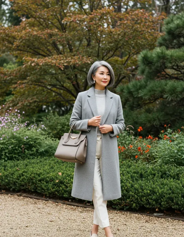 This outfit is the epitome of graceful fall style. It starts with a pale gray wool coat layered over a matching gray mock-neck sweater, creating this calm, tonal effect that s just so pretty. The cream ankle-length trousers keep it light and polished, while the sleek white loafers add that crisp finishing touch. A structured taupe handbag adds depth and pulls everything together in a super refined way.