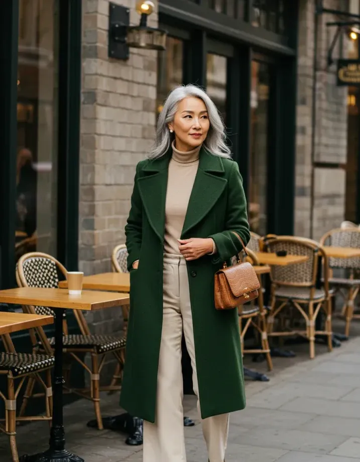 This look is pure understated chic. A soft beige turtleneck pairs beautifully with cream tailored trousers for a clean, polished base. The star of the show is that forest green wool coat, which brings just the right amount of color without being loud. Add in the caramel brown loafers and the structured leather bag, and you ve got a sophisticated outfit that s cozy and classy all at once.
