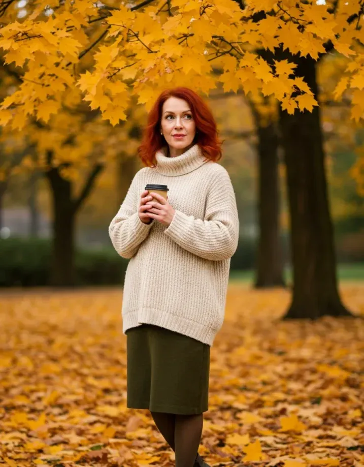This outfit is basically what pumpkin-spiced dreams are made of. The oversized cream turtleneck sweater is soft, cozy, and effortlessly chic. It s paired with an olive knee-length skirt that keeps things balanced and flattering. Dark tights and sleek black ankle boots add structure and make it perfect for crisp weather strolls through fallen leaves. And let s be honest, holding a coffee cup just completes the whole vibe.