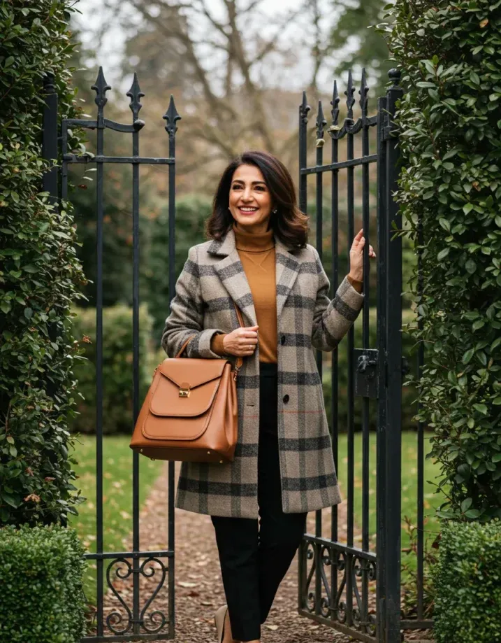 This outfit is autumn sophistication at its best. The cozy camel turtleneck adds warmth and glow to the base, while the checkered coat brings in timeless pattern and structure. Black tapered trousers keep the look sleek and balanced. The tan leather handbag and beige ballet flats are the perfect finishing touches polished, neutral, and totally chic.