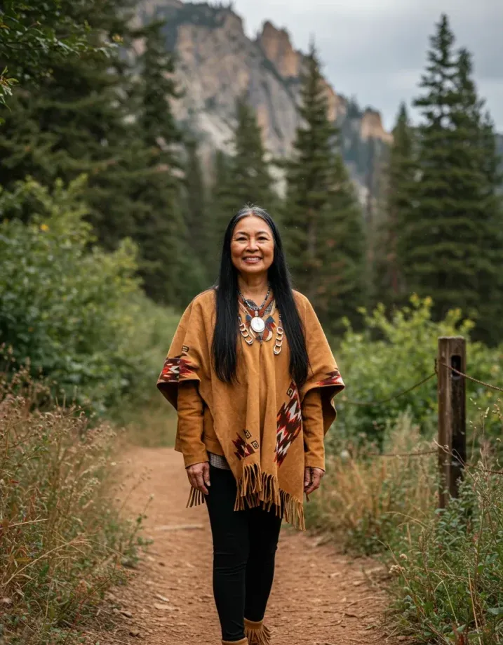 This outfit is rooted in comfort and connection. The rich tan poncho with tribal-inspired patterns and fringe detailing gives off serious cozy-season energy. It s paired with simple black leggings that keep the silhouette clean and let the top really shine. The fringed moccasins and layered statement necklace add beautiful texture and cultural personality to the whole look.