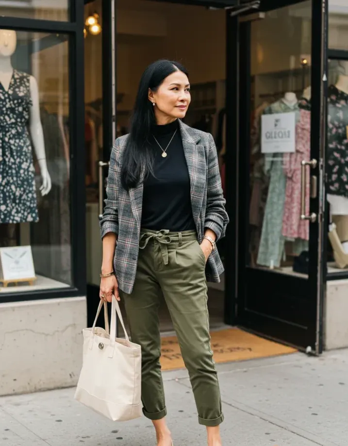 This outfit nails the smart-casual vibe without even trying too hard. It starts with a classic black top tucked into high-waisted olive green paperbag pants, cinched with a subtle tie belt for extra shape. The plaid blazer adds just the right touch of polish, and the nude ballet flats and cream tote keep everything grounded and practical. Gold accessories and a simple pendant necklace add a tiny sprinkle of glam.