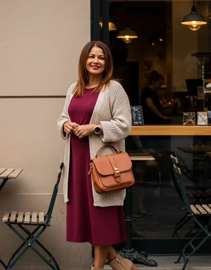 This outfit is fall comfort with a stylish twist. The deep burgundy midi dress brings a beautiful pop of rich color, while the chunky beige knit cardigan wraps it all in warmth. The tan ankle boots give it that perfect seasonal vibe, and the structured leather handbag adds a polished touch. The look is simple but so thoughtfully put together.