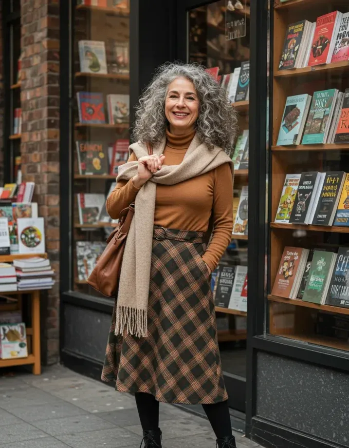This look is giving all the cozy autumn bookstore energy. It features a warm caramel turtleneck tucked into a high-waisted A-line plaid skirt with earthy green and rust tones. A soft beige scarf is casually draped over the shoulders, and black tights paired with lace-up combat boots add a fun contrast to the vintage vibe. The brown leather tote bag finishes the look with a touch of everyday practicality.