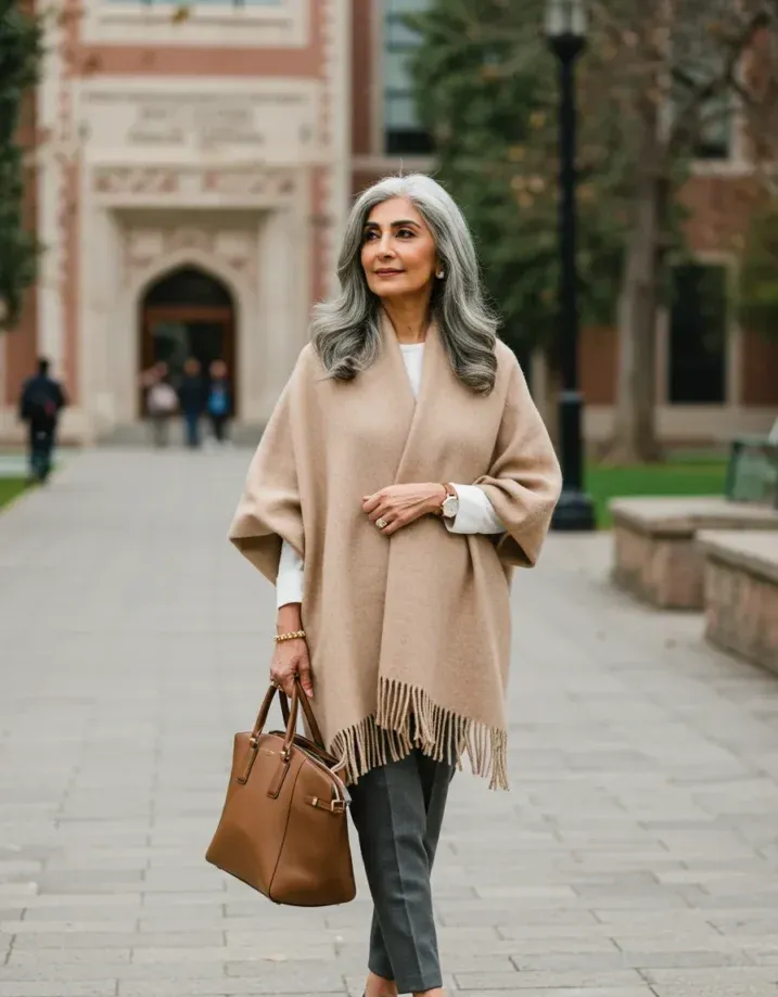 This look is peak effortless elegance. The soft beige wrap drapes beautifully with its fringe detailing, giving that cozy-chic feel without being too bulky. It s layered over a classic white top and paired with tailored gray trousers for a clean, put-together base. Black loafers and a structured caramel handbag complete the look with polish and practicality.