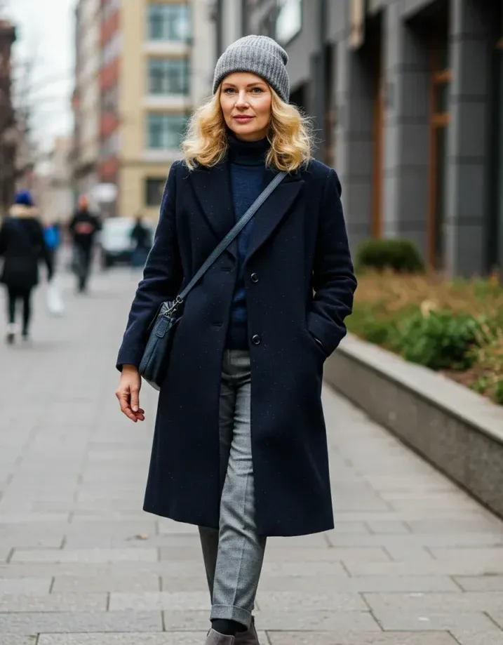 This outfit is the perfect blend of city chic and cozy fall layering. The deep navy coat brings a sleek, tailored feel while the navy turtleneck underneath keeps it tone-on-tone stylish. Light gray cuffed trousers soften the look, and those gray suede ankle boots are such a smart, comfy touch. A simple knit beanie and a crossbody bag finish off the look with casual ease.