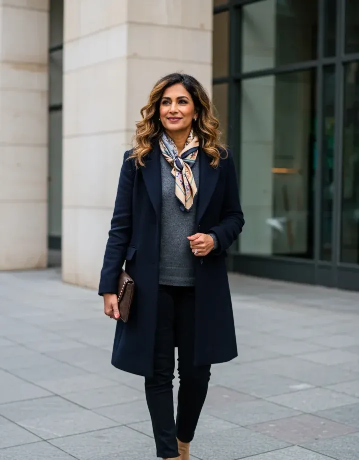 This look is classy, sharp, and has that quiet power vibe going on. The navy tailored coat sets the tone, layered over a simple grey sweater and slim black pants. What really brings it all to life is that silk scarf tied at the neck it s playful, elegant, and so very French-inspired. The tan ankle boots lighten up the palette, and the textured clutch adds just enough interest to make it feel like a full look.