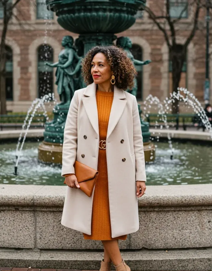 This outfit is all about warm tones and structured elegance. The ribbed rust-orange sweater dress gives off rich fall vibes while keeping things simple and flattering. Layered with a tailored cream double-breasted coat, the look becomes instantly polished. The tan ankle boots and envelope clutch tie it all together in a beautifully coordinated way, and those hoop earrings add a little bold sparkle.
