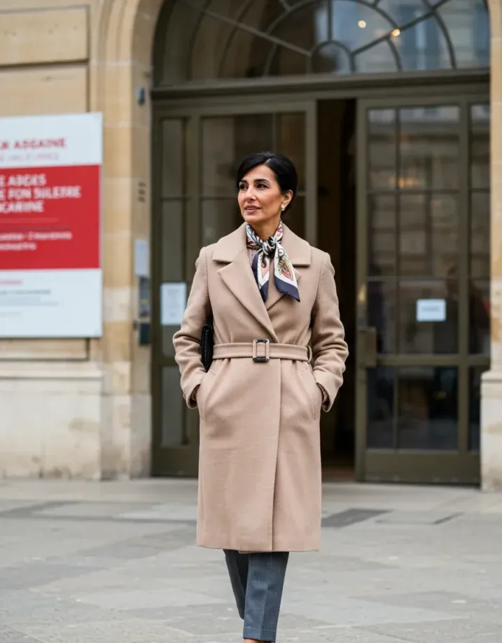 This outfit is the definition of refined elegance. The belted camel coat gives a structured, flattering silhouette that feels polished and timeless. It s paired with tailored grey trousers for a sophisticated base, and the silk neck scarf adds a lovely Parisian touch with its pop of color and pattern. Classic black pumps and a sleek clutch finish off the look with understated grace.