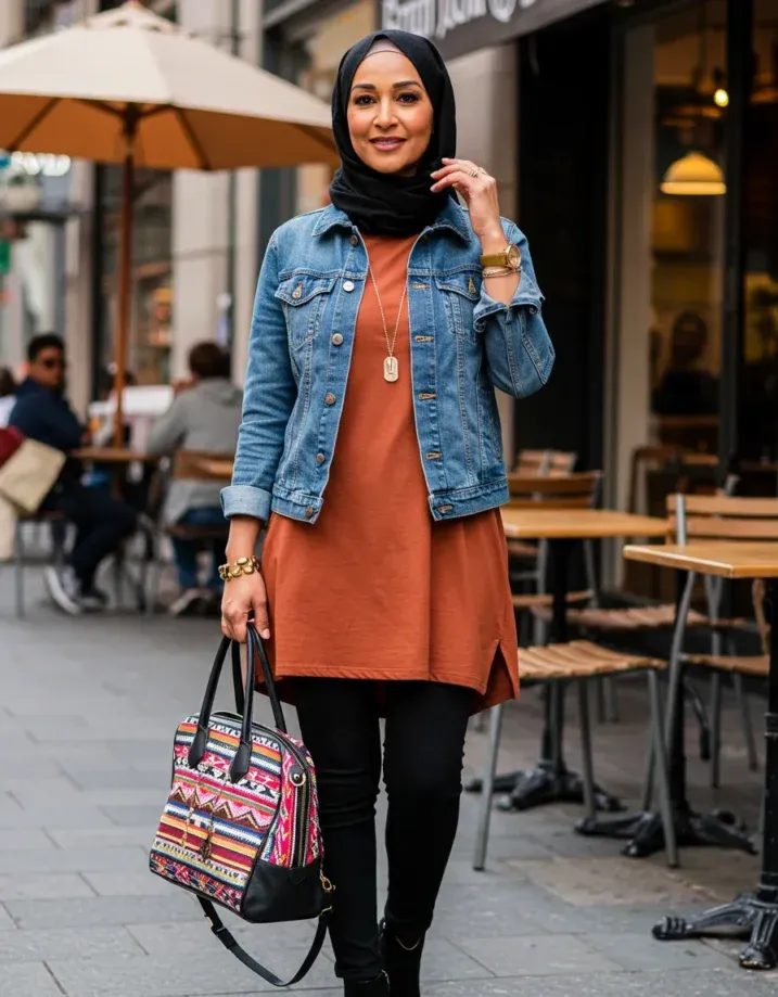 This outfit is cute, comfy, and full of personality. The warm rust tunic gives that perfect autumn feel and flows beautifully over black leggings, keeping things sleek and flattering. A fitted denim jacket adds that classic touch, and the black ankle boots give it a little edge. The standout piece? That colorful patterned bag bold, fun, and totally fabulous.
