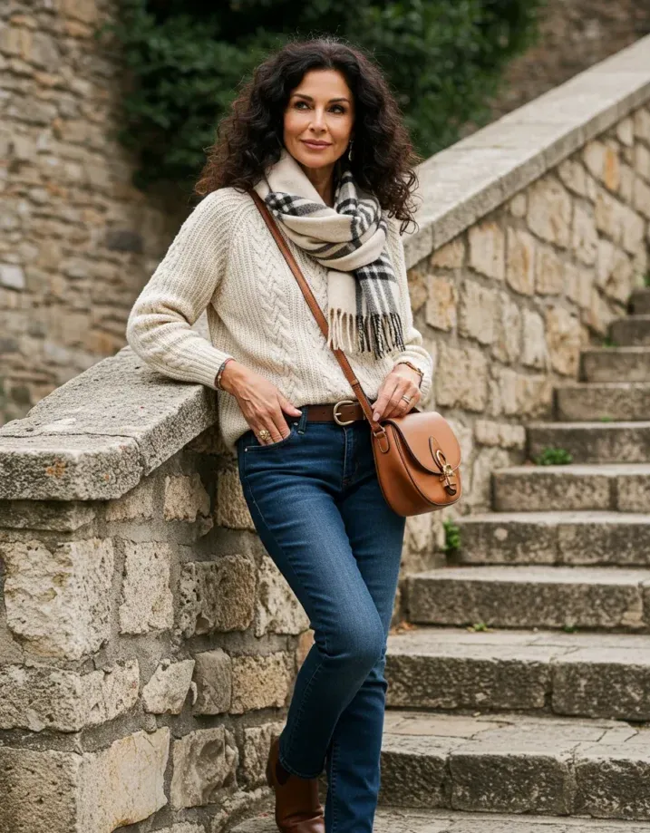 This outfit is cozy fall perfection. The cream cable knit sweater has that chunky, handmade feel we all secretly crave when the weather turns crisp. It s tucked slightly into a pair of classic dark-wash jeans, which keep the look clean and flattering. A beige plaid scarf adds just the right touch of pattern, and the caramel crossbody bag and matching Chelsea boots pull everything together with warm autumn charm.