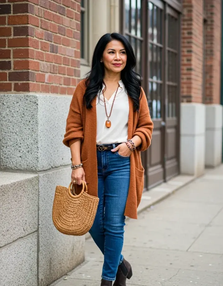 This outfit is the definition of comfy-cute. It features a soft, rust-colored cardigan layered over a simple cream blouse, paired with classic skinny jeans and chocolate brown ankle boots. The accessories bring it all together a long pendant necklace, beaded bracelet, and that woven handbag that gives it such a cozy, fall-market feel. The vibe is warm, relaxed, and perfectly casual without feeling sloppy.