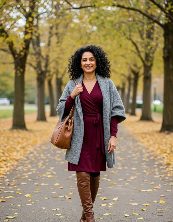 This look is the perfect balance of soft and structured. The deep burgundy wrap dress hugs in all the right places without being clingy, and the heather gray shawl drapes so effortlessly over the shoulders. It s cozy without looking bulky, which is always a win. Tall brown leather boots and a tan tote bag pull the outfit together and give it that polished autumn feel.