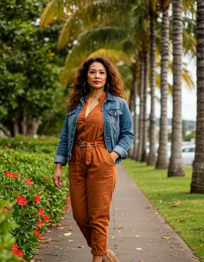 This look is bold, fun, and full of personality. The rust-colored utility jumpsuit has a flattering belted waist and just the right amount of structure, making it both comfy and cool. Layered with a classic cropped denim jacket, it gets that laid-back vibe without losing its edge. Nude wedge booties keep the silhouette clean and modern, while oversized hoop earrings give it a little sass.