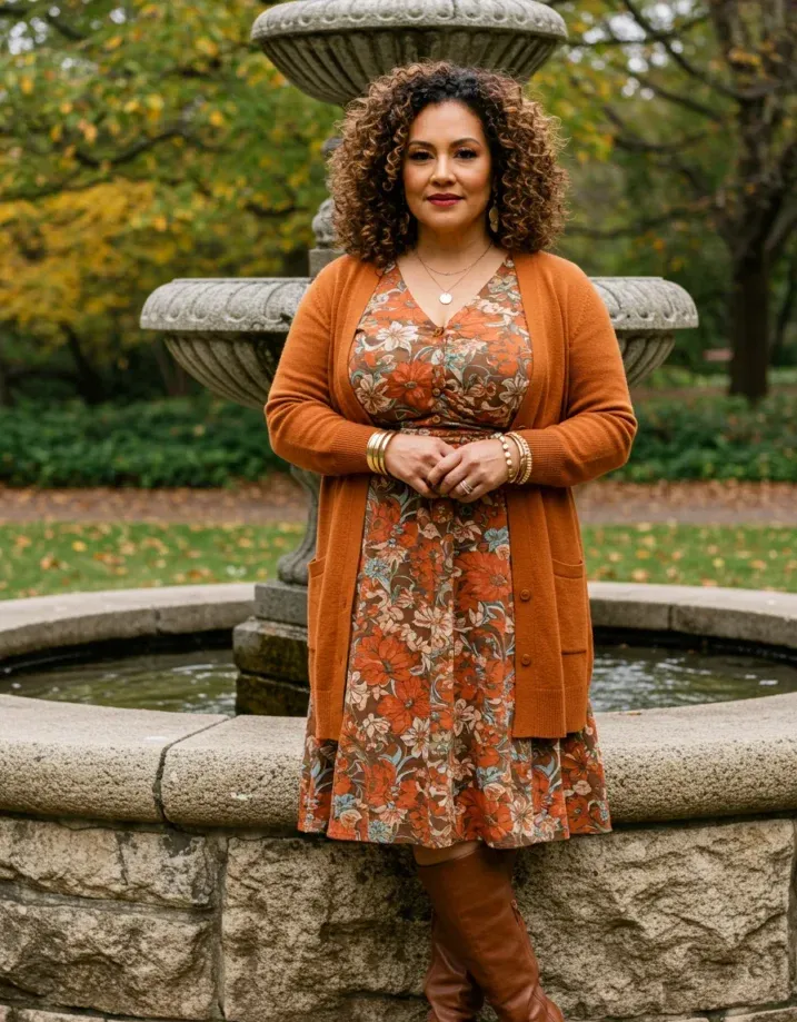 This outfit is autumn wrapped in a look. The floral dress features beautiful shades of rust, cream, and sage that blend perfectly with the season. It s topped with a cozy rust-colored cardigan that ties in seamlessly and adds that warm, lived-in feel. The knee-high leather boots bring it all together, giving the outfit just the right amount of polish. Gold jewelry adds a soft shimmer without overpowering the look.