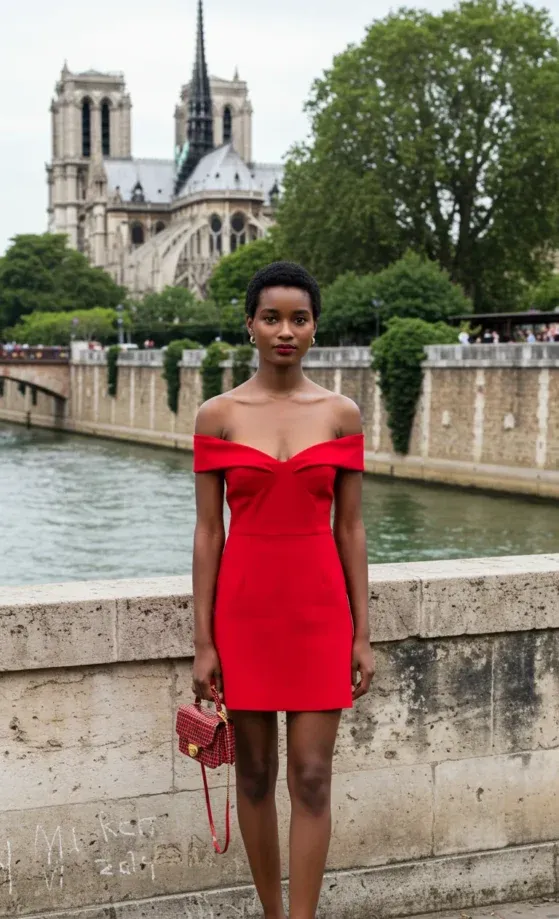 This stunning red dress is a showstopper, perfectly designed to turn heads on a warm summer day. The dress features an off-the-shoulder neckline that adds a touch of sophistication and femininity, while the structured design cinches at the waist to create an hourglass shape. The bright red color contrasts beautifully with the Parisian backdrop, and her matching red bag adds a coordinated pop of color, making this an effortlessly stylish outfit.