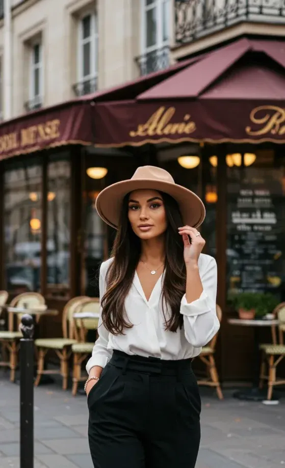 This outfit is the epitome of effortlessly chic. A crisp white blouse is knotted at the waist, creating a relaxed yet polished look, while high-waisted black trousers add a touch of sophistication. The beige wide-brimmed hat and the classic crossbody bag give the outfit a Parisian flair, making it the perfect combination of comfort and style. The soft curls and natural makeup add to the laid-back elegance, making it a great choice for a sunny afternoon in the city.