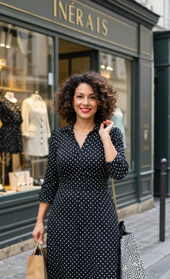 This playful yet chic look combines the timeless appeal of polka dots with a classic button-down dress design. The model wears a black dress adorned with white polka dots, featuring a flattering v-neckline and a waist-cinching fit. She pairs it with a casual gold chain, and her accessories an elegant tan crossbody bag and a monochrome shopping bag add an effortlessly stylish touch. The background of a charming Parisian street café sets the perfect scene.
