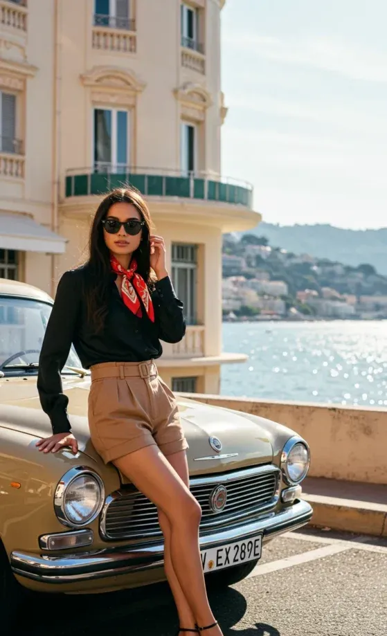 This chic outfit is perfect for a summer day in the city, exuding effortless style and sophistication. The model is rocking a black blouse with a deep v-neck and button-down detail, paired with beige high-waisted shorts that cinch at the waist with a belt. A bold red scarf is tied around her neck, adding a pop of color to the ensemble. With sleek black heels and oversized sunglasses, she completes the look while leaning casually against a vintage car near the coastline, adding to the French Riviera vibe.