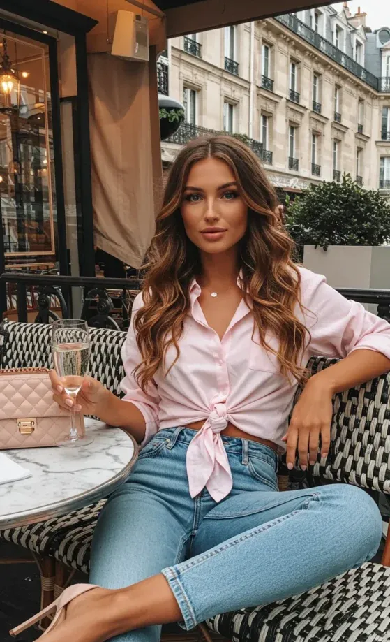 This effortlessly chic ensemble exudes Parisian elegance, perfect for a casual outing or a café stop. The model pairs a soft pink tie-front shirt with high-waisted light blue jeans, showcasing a laid-back yet polished vibe. Her nude heels elevate the look, giving the outfit a feminine touch, while the accessories like her subtle necklace and the glass of champagne complete the ensemble with understated class.