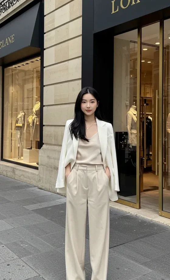 This chic neutral ensemble is perfect for a sophisticated yet effortless Parisian vibe. The model wears a tailored white blazer over a satin beige top, creating a soft, luxurious look. The high-waisted, wide-leg trousers complete the outfit, offering a clean and polished silhouette. She accessorizes with minimalist jewelry, and the outfit is rounded off with nude pointed-toe heels, adding height and refinement. This look is effortlessly stylish, perfect for a day of shopping in Paris or a casual meeting.