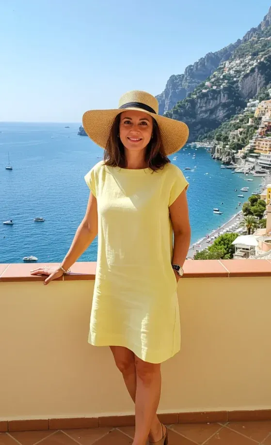 This breezy yellow dress is the perfect outfit for a relaxing day by the water, offering a combination of comfort and style. The model wears a simple, loose-fitting dress with short sleeves, making it ideal for warm weather. She completes the look with a wide-brimmed straw hat and tan block heels, creating a laid-back yet polished appearance. The stunning view of the coast in the background enhances the feeling of an idyllic summer vacation.