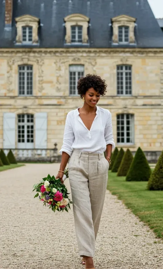 This outfit effortlessly combines timeless elegance with a relaxed, chic vibe. The white button-up blouse is made from a breathable fabric, perfect for warmer days, with a loose fit that drapes beautifully. Paired with light linen trousers, it radiates a laid-back sophistication. The floral bouquet adds a fresh, whimsical touch, while the open-toe sandals and the clean, minimalist look of the outfit make it perfect for a stroll in the countryside or a casual gathering. The neutral tones and the soft, natural textures make this look both fresh and effortlessly stylish.
