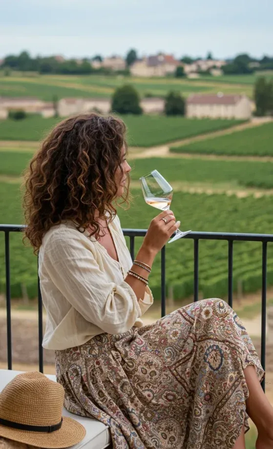 I absolutely adore how effortlessly beautiful this outfit is! The light blouse gives off a breezy, laid-back vibe, while the boho skirt adds a touch of whimsy with its lovely pattern and flow. The whole look is comfortable yet so stylish perfect for a day of wine tasting or a casual stroll in the countryside. Plus, the accessories are just right, adding a bit of personality without taking away from the main look. It s the kind of outfit that makes you feel relaxed, yet put-together, and totally ready to enjoy the moment!