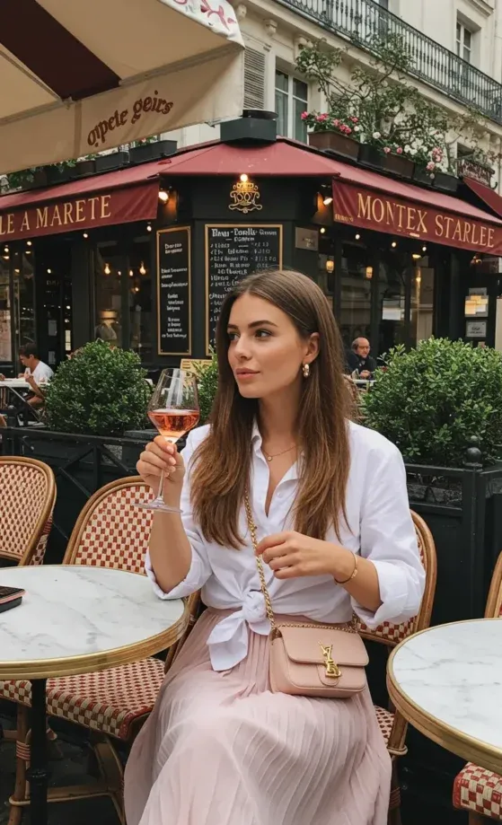This outfit radiates French elegance with a touch of casual sophistication. The model wears a crisp white button-down shirt, casually knotted at the waist, paired with a soft pleated blush pink skirt. The neutral tones of the skirt complement the fresh white blouse, creating a timeless, feminine look. Accessorized with a pink YSL handbag and gold jewelry, she enjoys a glass of rosé at a charming Parisian café, capturing the essence of effortless style.