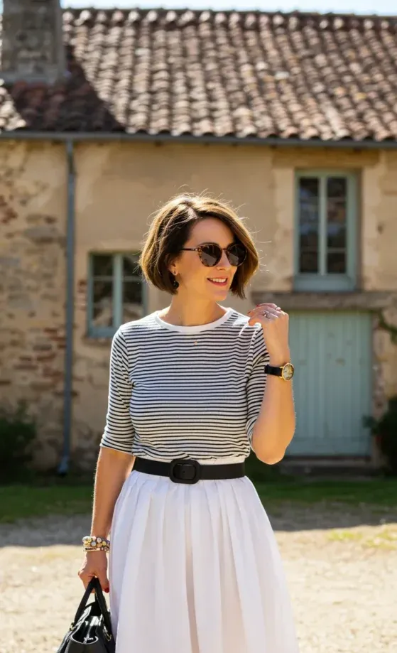 I absolutely adore this look! It’s simple yet so stylish, with classic stripes paired with a flowy white skirt that screams French elegance. The black accents from the belt and bag ground the outfit, making it feel put-together while still relaxed. It’s one of those looks you can wear on a sunny afternoon while strolling through a charming street, looking perfectly effortless yet chic. It’s the perfect balance of comfort and style, and who doesn t love that?