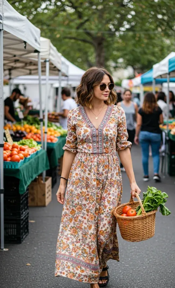This effortless bohemian-inspired outfit is perfect for a day out at the market. The model wears a flowing floral dress in soft neutral tones, featuring a V-neck and long sleeves that roll up, creating a laid-back, comfortable fit. The dress cinches at the waist with an elastic band, enhancing the silhouette. Paired with black sandals and accessorized with a chic gold necklace and aviator sunglasses, she carries a woven basket filled with fresh produce, adding a practical yet stylish touch.
